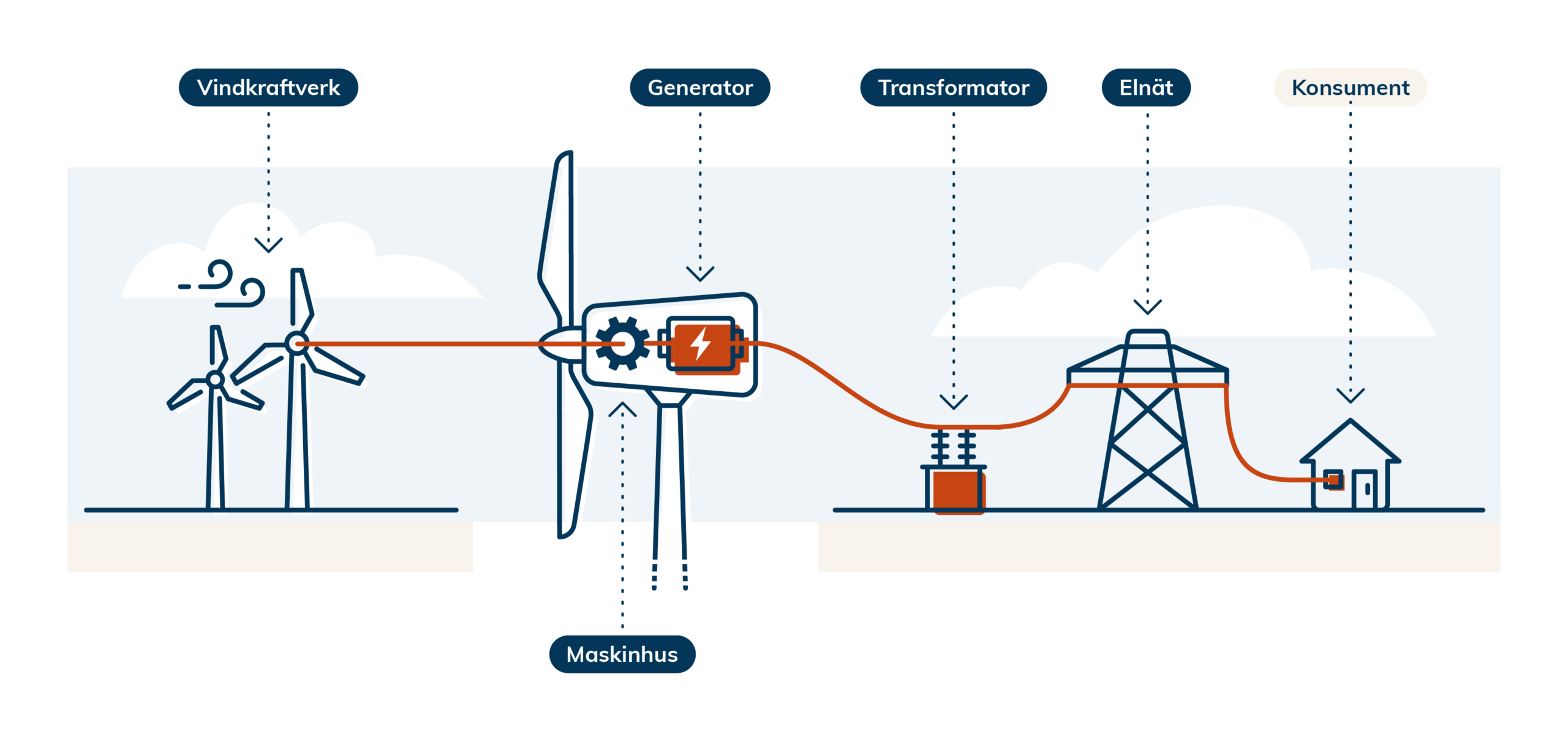 Vinden driver vindkraftverkets rotorblad, som är kopplade till en generator i maskinhuset. Generatorn omvandlar rörelseenergin till elektrisk energi. Elen överförs via en transformator till elnätet och därifrån vidare till konsumenternas hem och företag. Hela processen är utsläppsfri och baserad på en förnybar naturkraft: vinden.