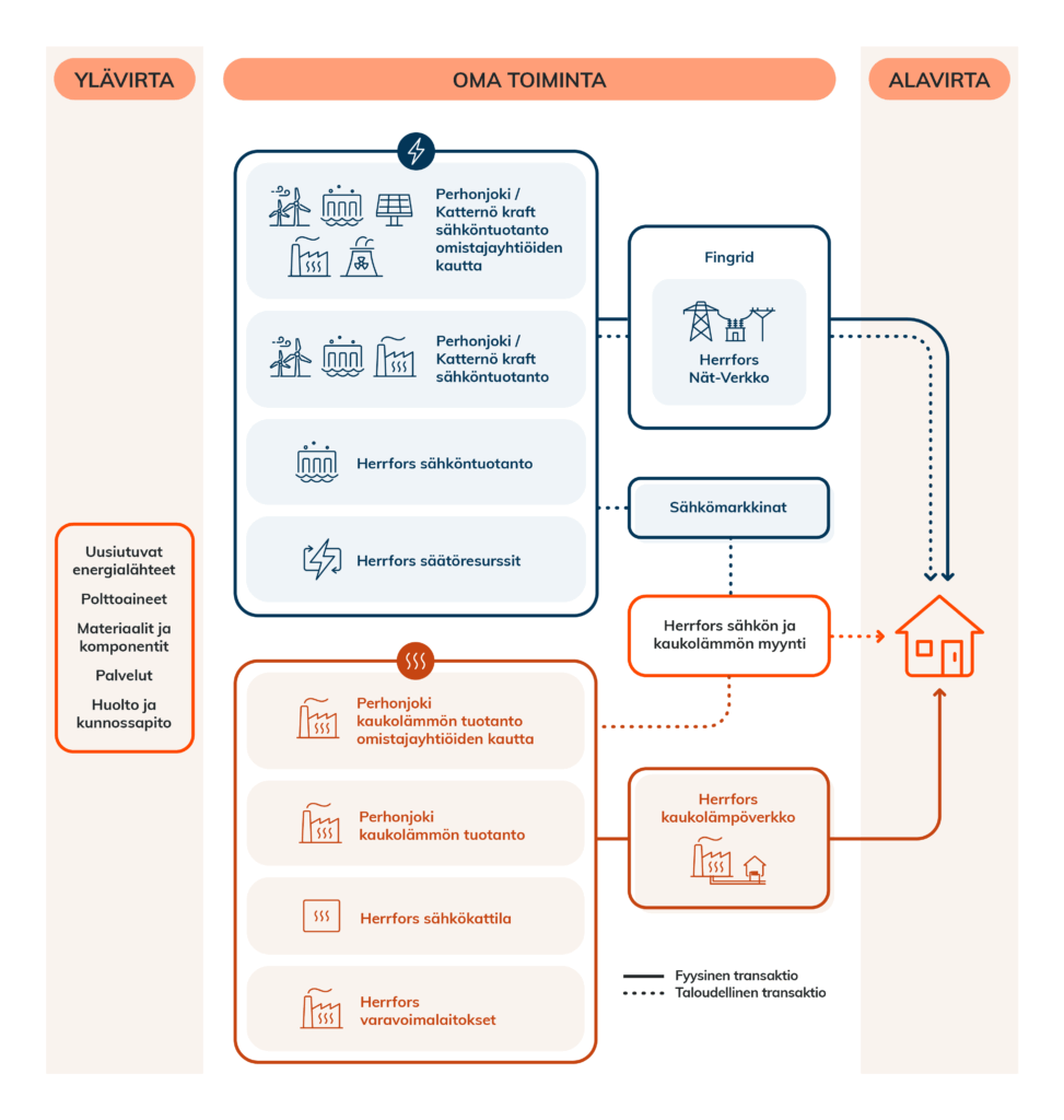 Herrforsilla on omaa sähköntuotantoa vesivoimalla sekä omia säätöresursseja. Perhonjoki/Katternö Kraft tuottaa sähköä omalla tuotannollaan, mutta saa sähköä myös omistajayhtiöidemme kautta. Sähkö toimitetaan fyysisesti sähköverkon kautta asiakkaille (alavirta: arvoketjun osa, joka tapahtuu yrityksen toiminnan jälkeen). Herrfors Nät-Verkko vastaa tietystä verkkotoiminta-alueesta seudulla, sisältäen sekä alueverkon että jakeluverkon. Taloudelliset transaktiot tapahtuvat sähkömarkkinoiden (NordPool ja Fingrid/eSett) sekä Herrforsin sähkönmyynnin kautta loppuasiakkaille.